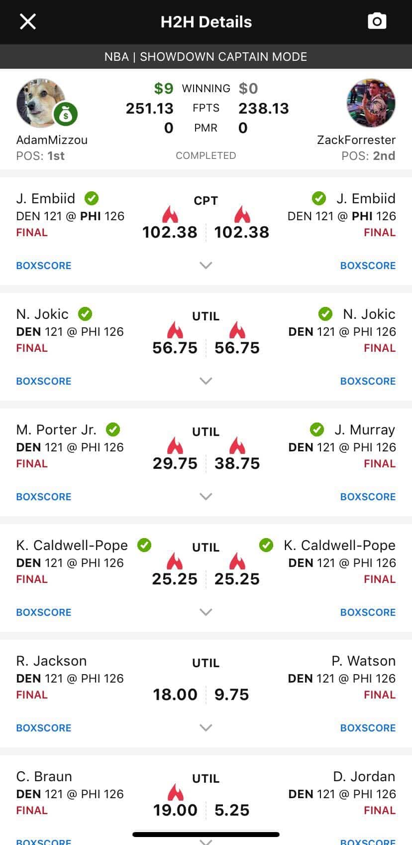 I also enjoy playing Showdown Captain Mode contests, particularly for NBA games I want to sit down and watch. During the Denver Nuggets-Philadelphia 76ers game in January of 2024, I entered a Showdown Captain Mode Head-to-Head contest. As you can see below, my opponent and I had very similar teams, but I emerged with a narrow win, turning my $5 entry fee into $9: