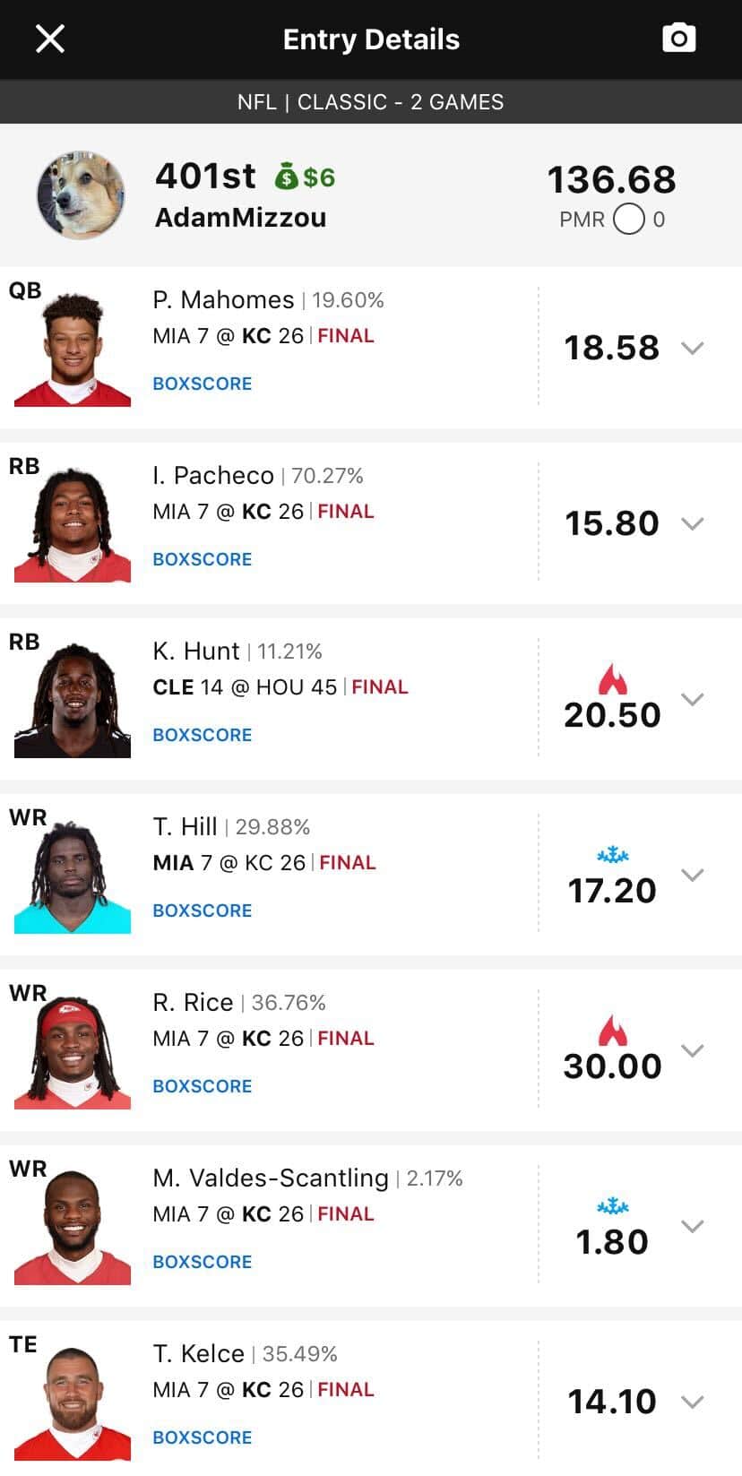 I loaded up on Kansas City Chiefs players and it paid off, as you can see below: