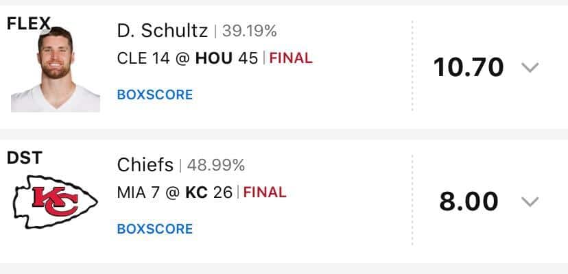 Choosing Kareem Hunt from the Cleveland-Houston game ended up benefiting me in a big way. Even with Tyreek Hill having an off night (by his standards), I was able to cash in this tournament. Some of my other entries didn’t fare as well, but I’ll take a win when I get one with no questions asked!