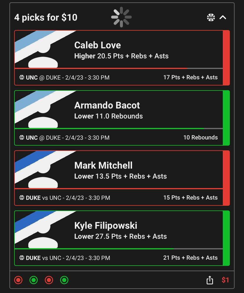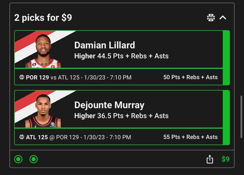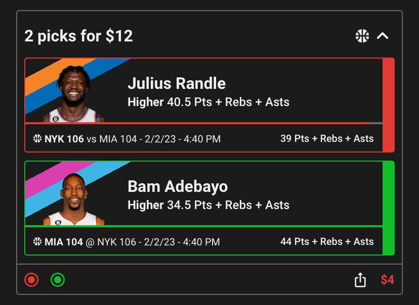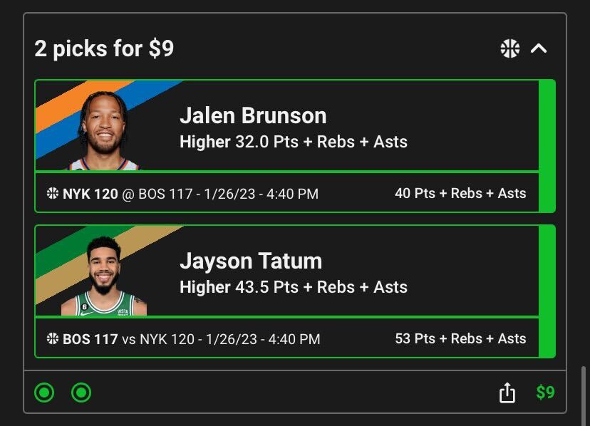 Here are some screenshots of some NBA pick’em contest screens. You’ll see the higher/lower options for a Jimmy Butler game as well as a Spencer Dinwiddie pick, then the combined “slip” showing the picks you’ve made and how much money you wish to use as your entry fee (as well as the potential money you can win).