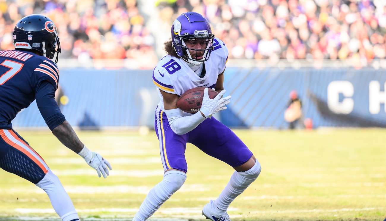 Justin Jefferson (18) runs after a catch during the second quarter against the Chicago Bears at Soldier Field. Daniel Bartel-USA TODAY Sports