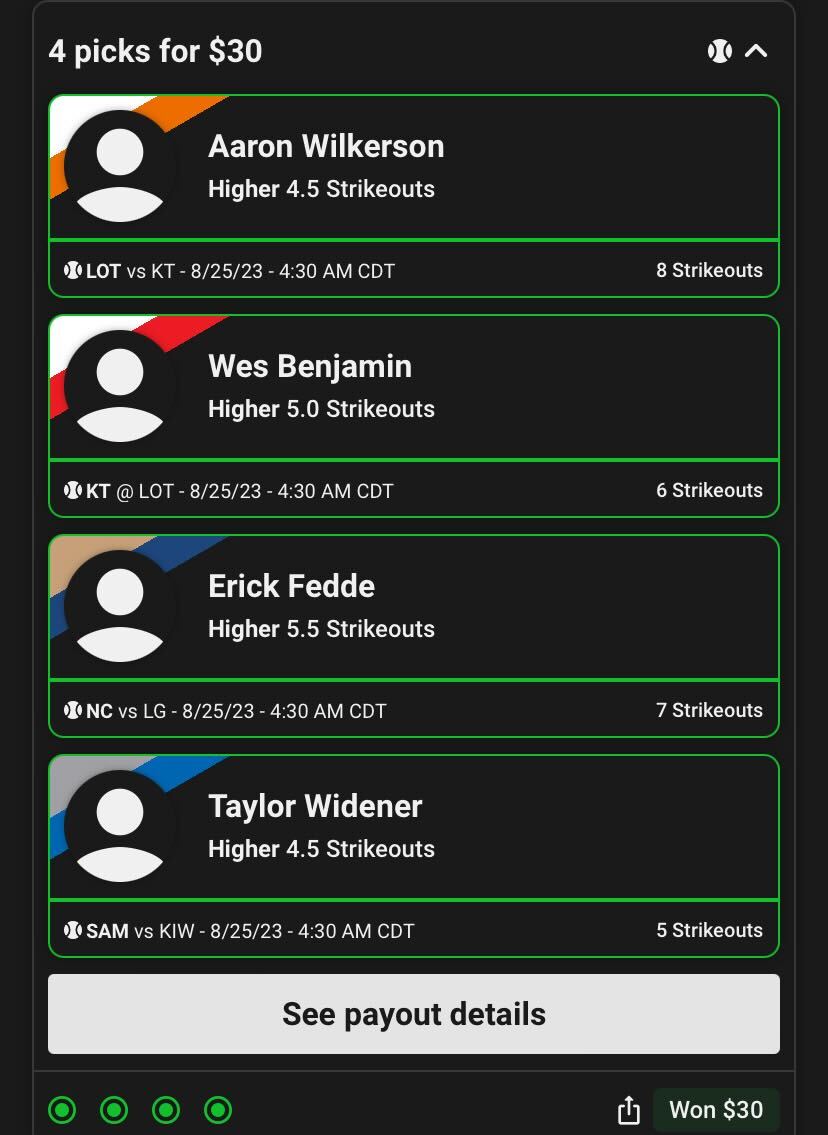 And though this is an MLB DFS page, I’d be remiss if I didn’t mention all of the professional baseball offerings over at Underdog. Heck, you can score a win before you wake up here in America by playing pick’em contests involving KBO (the Korean professional baseball league) action: