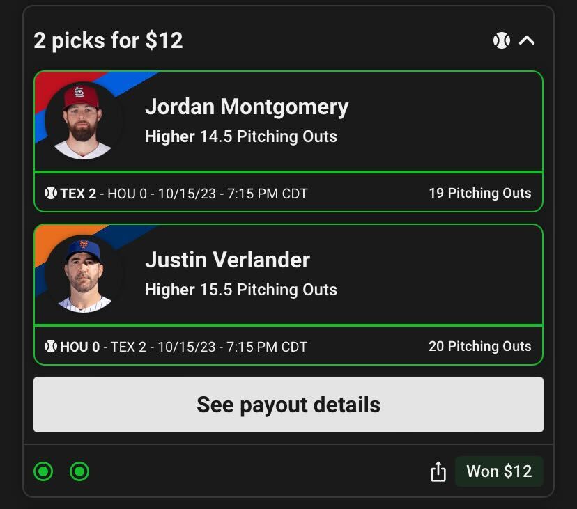 You’ll notice you are required to make at least 2 picks for an entry to be legitimate on Underdog. You also have to pick from at least 2 separate teams, so you can’t team up on Gerrit Cole and Aaron Judge on the same night, etc. If the Yankees were playing the Braves, you’d have to put something on Spencer Strider, Ronald Acuña or 1 of the other Braves players, too.
