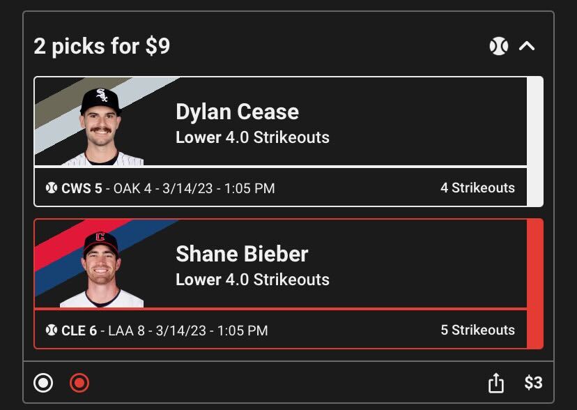 If a player hits his higher/lower line exactly, that part of the contest is voided. Here’s an example of a contest that was a draw, as Dylan Cease of the Chicago White Sox recorded exactly 4 strikeouts, giving me my $3 contest entry fee back: