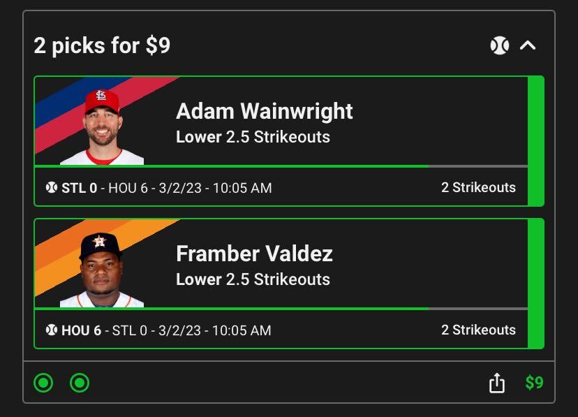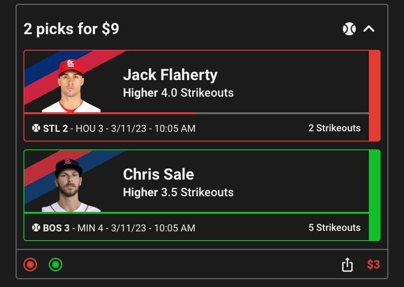 Next, we have a losing contest, where 1 pitcher (Jack Flaherty of the St. Louis Cardinals) didn’t hit the “higher” option on his strikeout total for a spring training game: