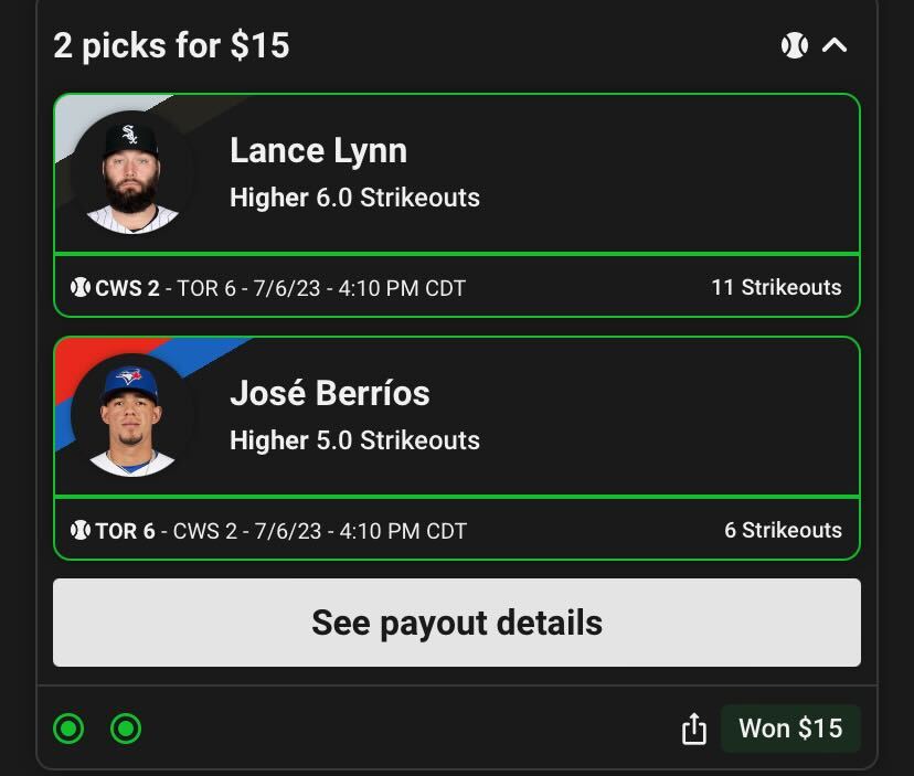 You know when you are letting your wife take a nap and you’re watching your infant daughter and there’s an afternoon baseball game on TV, so you’re locked in on it? (Or is that a situation that was specific to me during the early months of the 2023 season?) Either way, I managed to win some money on a White Sox-Blue Jays game, and I didn’t even wake up my wife when José Berríos struck out his sixth batter: