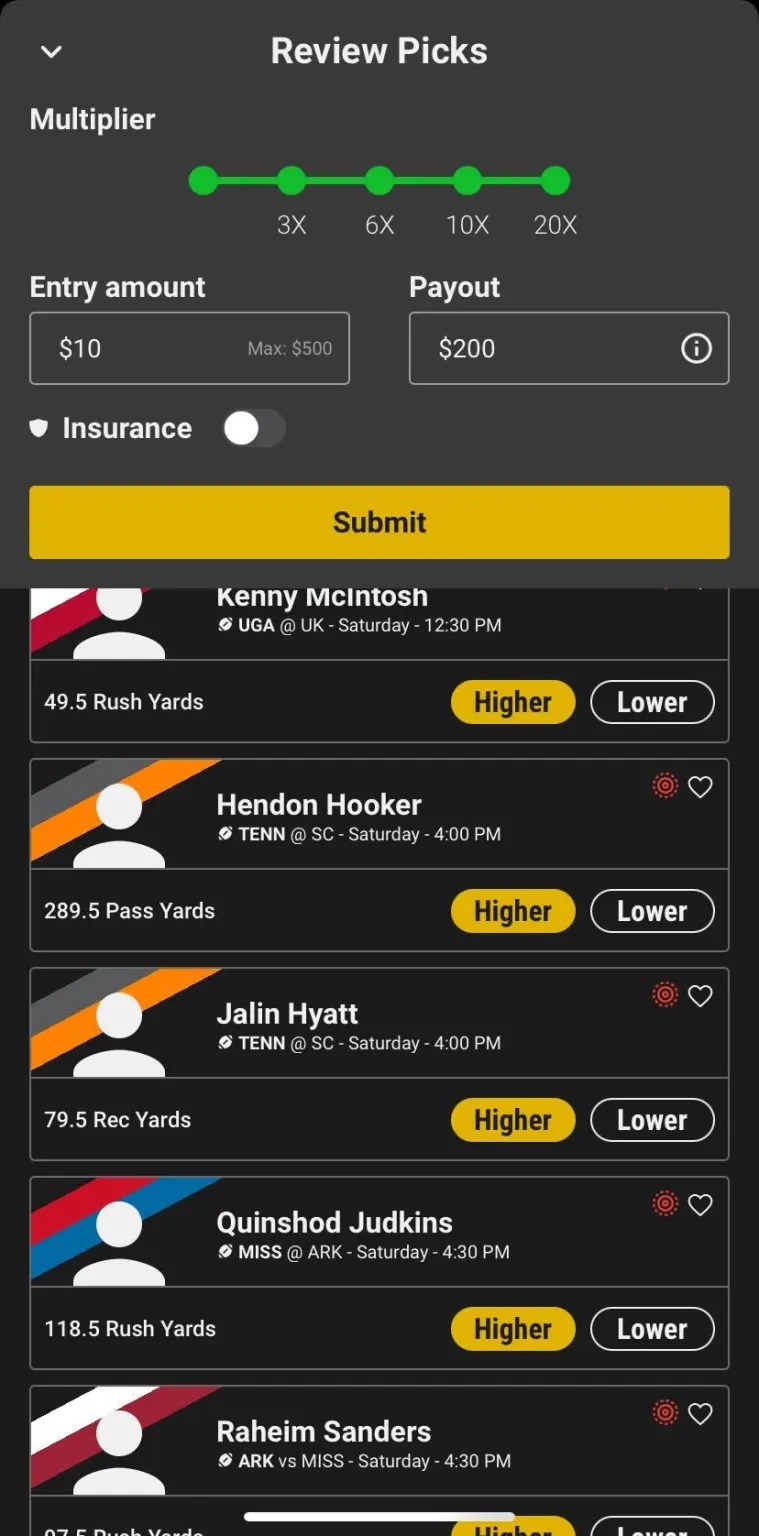 Instead, college football thrives on Underdog and Sleeper through pick’em contests, which work similarly to props at sportsbooks. Users can enter lower/higher contests (over/under) on specific lines, pick against a player to hit a certain line and so on!