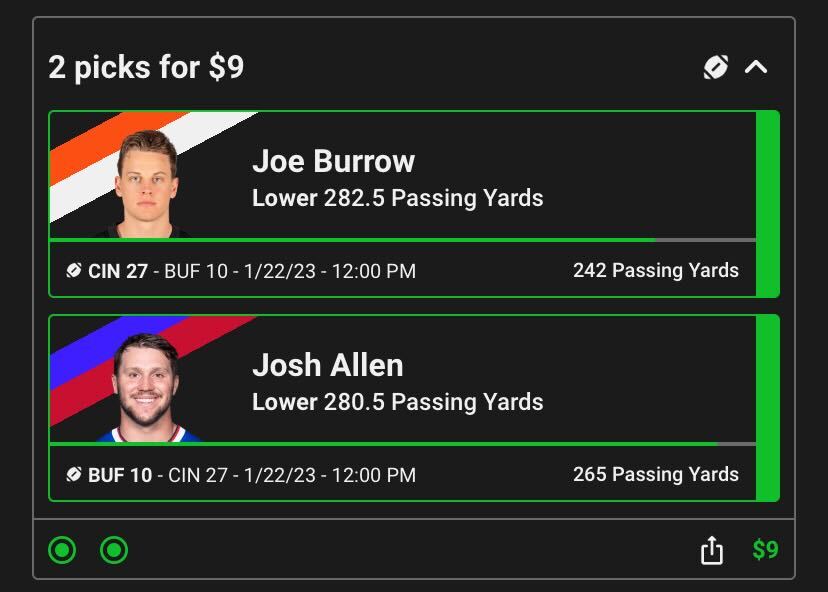 Here’s a look at a pick’em contest I won during the NFL playoffs, betting on both Joe Burrow and Josh Allen to go under their projected passing totals: