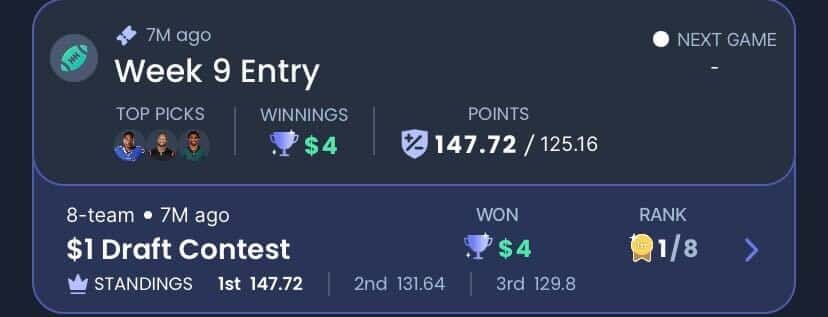 This was a Week 9 contest I entered on Sleeper. It was only a $1 entry fee and I took home first place, earning $4 for my efforts: