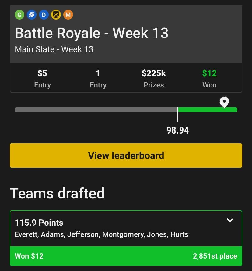 There are so many options to choose from. Below, you can see a big contest on Underdog, which featured thousands of players and $225,000 in prizes. I managed to win $12 on a contest with a $5 entry fee.