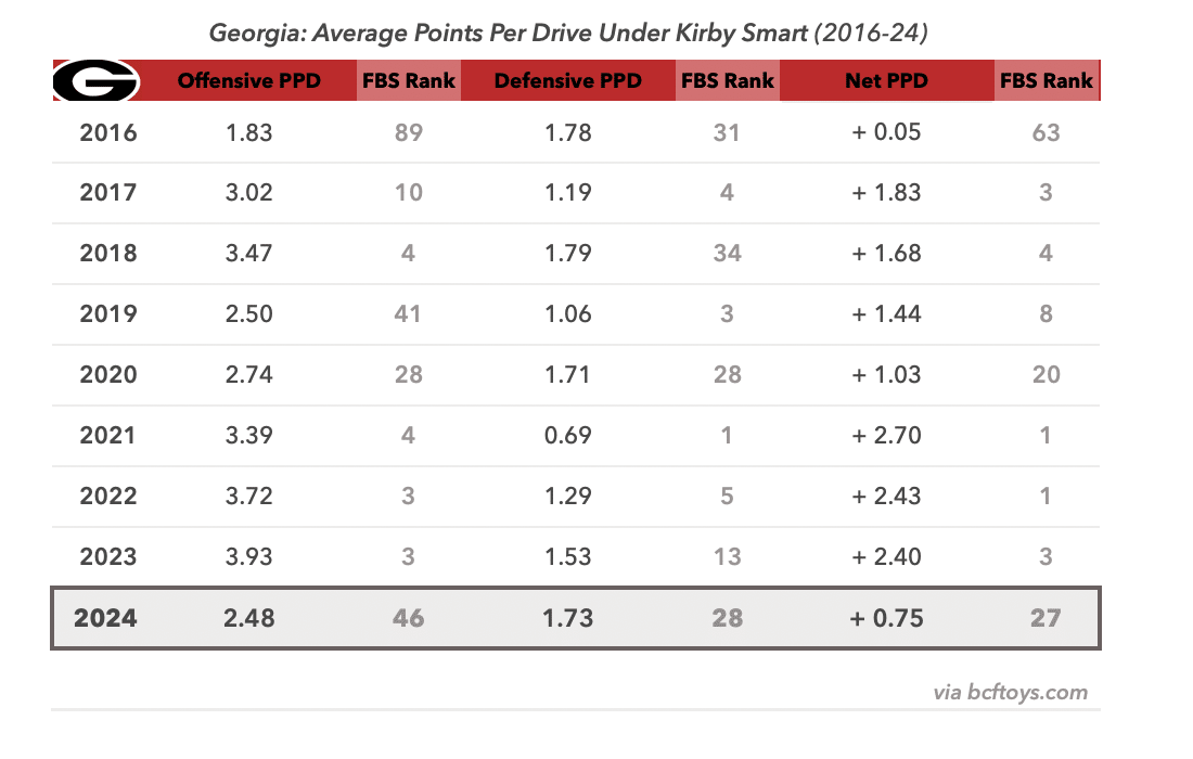 That’s Georgia’s average points per drive this season, according to efficiency guru Brian Fremeau, 48th nationally and on pace for UGA’s worst average PPD since Smart’s 1st season as head coach.