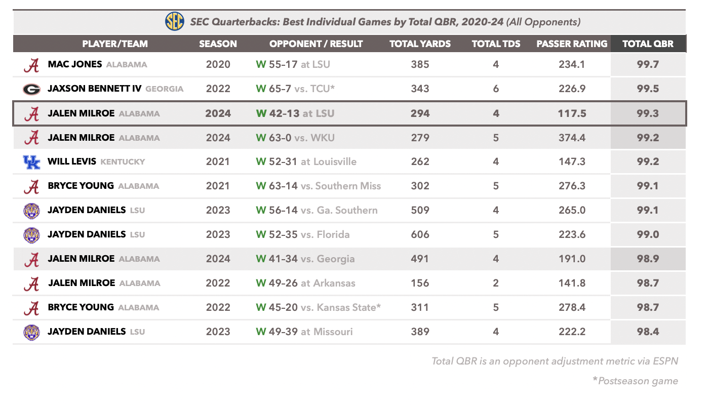 1. Alabama QB Jalen Milroe. When Milroe is at his best, he looks like God’s gift to the sport, and he’s rarely been better than when he’s facing LSU. In 2 starts against the Tigers he’s accounted for 668 total yards, 8 touchdowns (all rushing) and 40 first downs, emphatically ending LSU’s Playoff hopes in both seasons. His 99.3 Total QBR rating on Saturday set a career high and, along with his stellar September outings against Western Kentucky and Georgia, gives him the top 3 single-game ratings of the season among SEC quarterbacks.