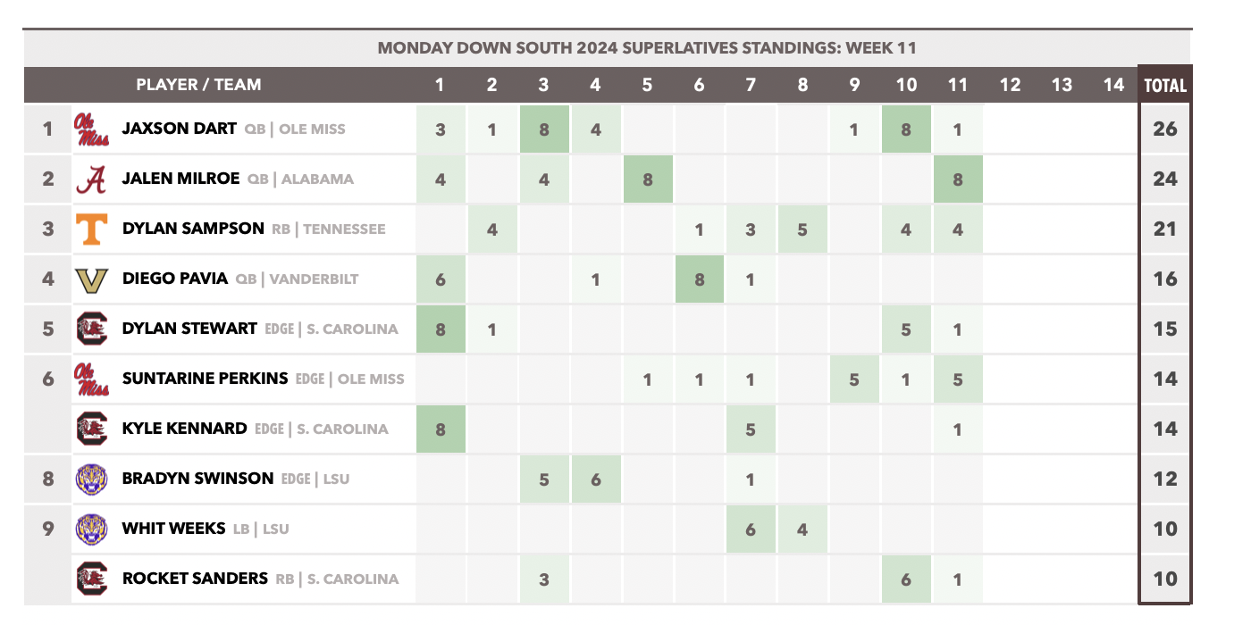 Honorable Mention: Texas QB Quinn Ewers, who between wide-open receivers downfield and screen passes that broke for big gains turned in one of the easiest 333-yard, 5-touchdown outings you’ll ever see in a 49-17 win over Florida. … South Carolina edge rushers Kyle Kennard and Dylan Stewart, who continued their season-long reign of terror with 11 combined QB pressures and a strip sack (by Kennard) in a decisive, 28-7 win at Vanderbilt. … South Carolina RB Rocket Sanders, who continued his late-season surge by accounting for 178 yards and 3 touchdowns against the Commodores. … Tennessee edge James Pearce Jr., who had recorded 6 QB pressures and a sack in the Vols’ win over Mississippi State. … Mississippi State RB Davon Booth, who ran for 120 yards on 6.3 per carry in Knoxville in a losing effort. … Ole Miss DB John Saunders Jr., who picked off a pass, broke up 2 others, and recorded a TFL in the Rebels’ win over Georgia. … Ole Miss QB Jaxson Dart, who accounted for 249 yards, a touchdown and an 89.7 QBR against the Bulldogs on a visibly gimpy ankle. … And backup Ole Miss QB Austin Simmons, who went 5-for-6 for 64 yards on his sole possession in relief of Dart — a crucial early TD drive that answered Georgia’s initial salvo and swung the pendulum back in the Rebels’ favor for the rest of the afternoon.