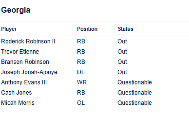 Now, Etienne has been ruled out for Saturday’s game against the Vols with Georgia confirming the news with Thursday’s availability report. An additional blow to the running back room was added with Cash Jones listed as questionable for the game.