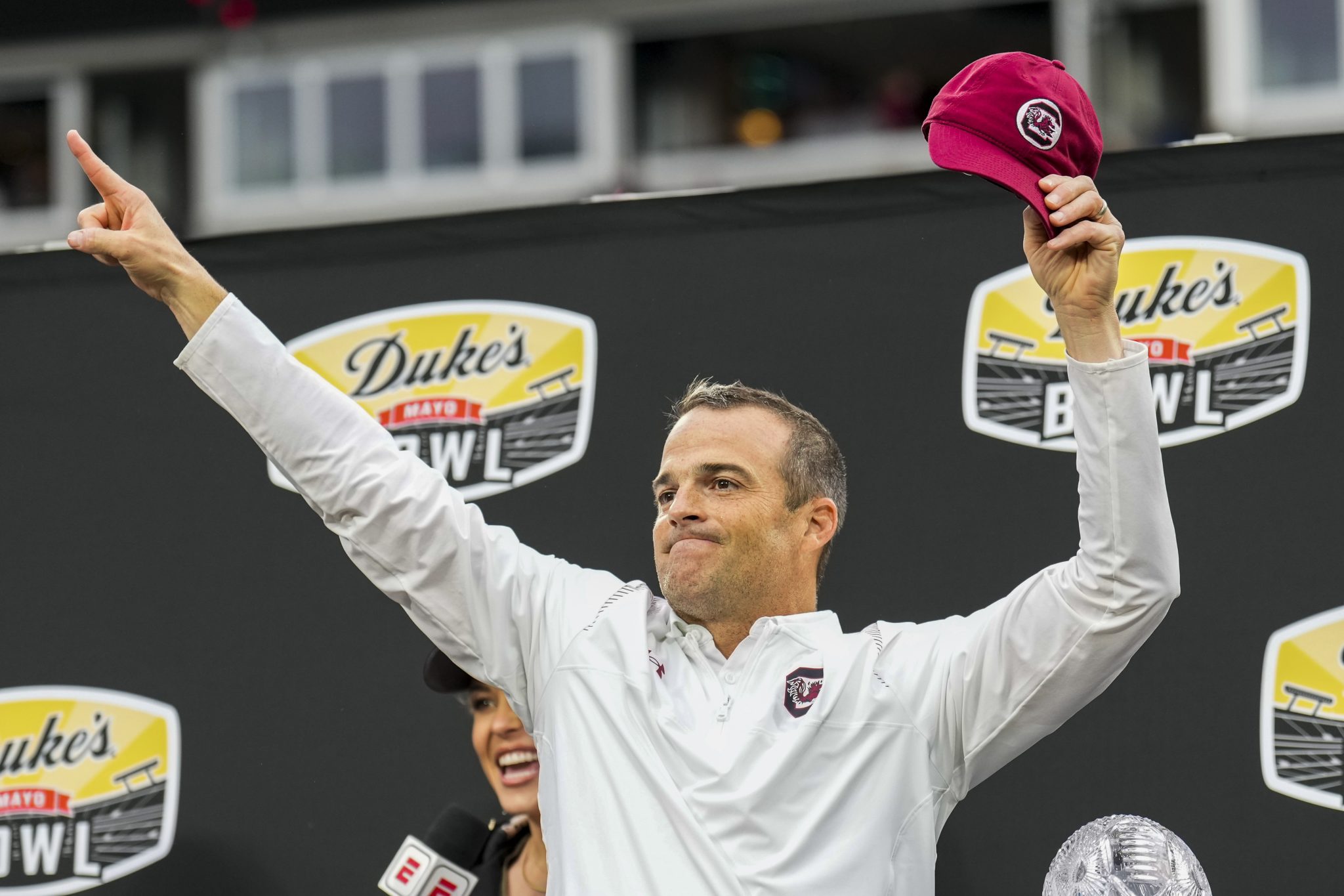 Dec 30, 2021; Charlotte, NC, USA; South Carolina Gamecocks head coach Shane Beamer acknowledges the fans after the win over North Carolina Tar Heels at Bank of America Stadium. Credit: Jim Dedmon-USA TODAY Sports