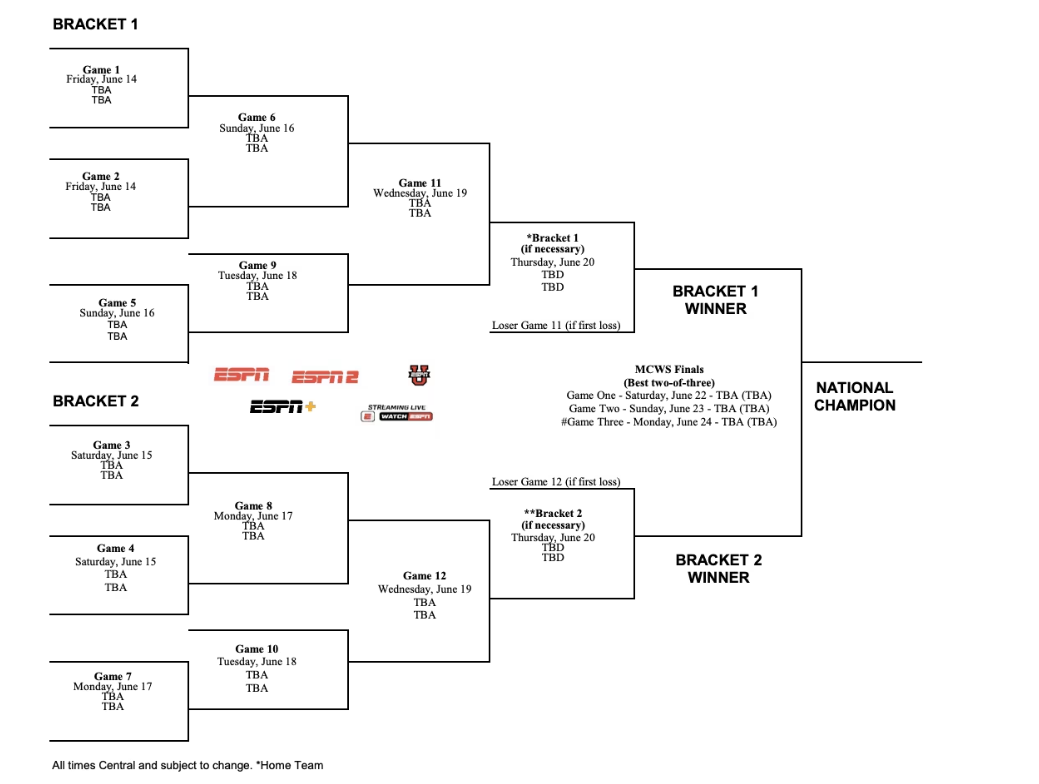 The NCAA Tournament Selection Show will be Monday, May 27. Sixty-four teams will begin play later that week in 16 regionals. Those 16 winners will meet in 8 Super Regionals. Those 8 winners advance to the College World Series. The CWS bracket features two pods, each with four teams. Each pod plays a double-elimination tournament. The winner of each bracket meet in a best-of-3 series to determine the College World Series champion.